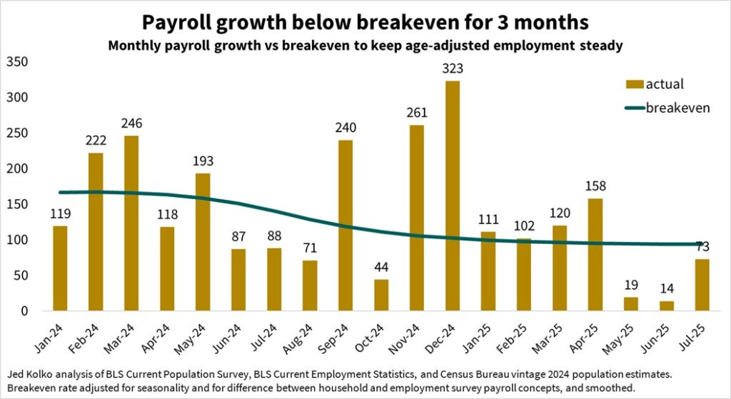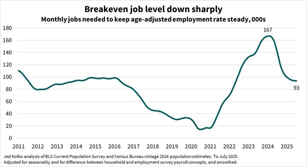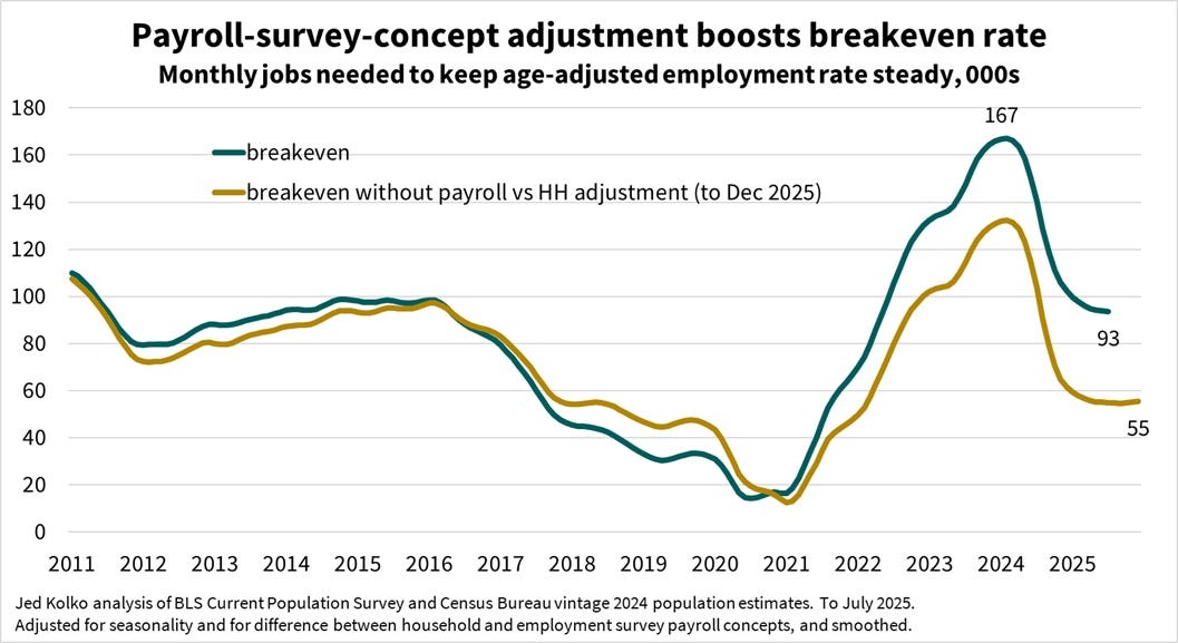 Also, the adjustment that aligns the household survey with the payroll survey concept of employment raises the breakeven rate meaningfully. Without this adjustment, the breakeven rate implied by Census population estimates is lower and will remain near 55 thousand throughout 2025.