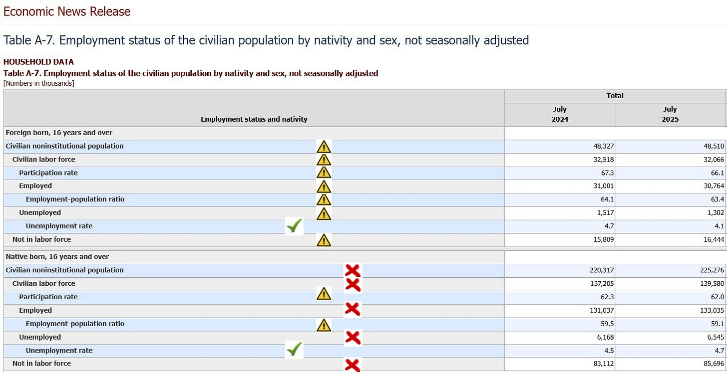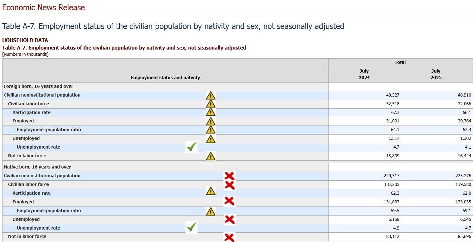 Let’s start with the household survey, or more formally the Current Population Survey. Data about native-born and foreign-born residents are in Table A-7.