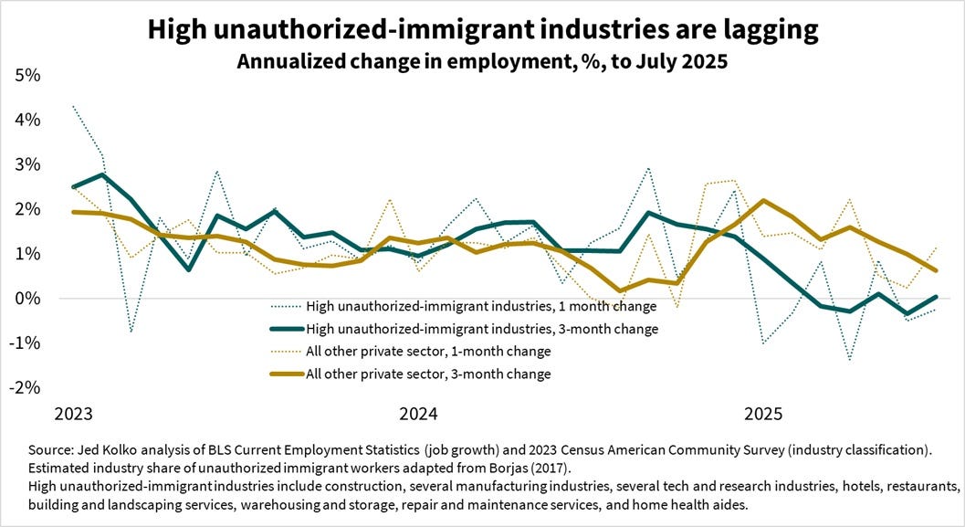 Focus on payroll employment changes in immigrant-reliant industries. Some industries, like construction and home health aide services, have a much higher share of immigrants in their workforce than many other industries do. Comparing job growth across industries shows how immigration trends are affecting the labor market. Job growth in immigrant-reliant industries has been flat in 2025, while job growth in the rest of the private sector remains positive.