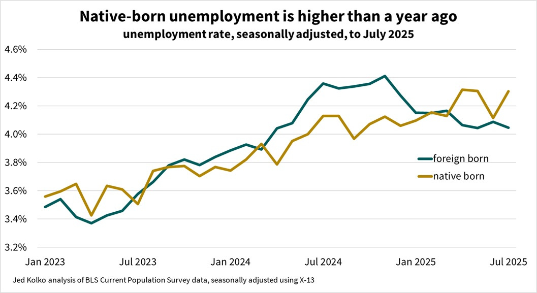 Focus on the unemployment rates for native- and foreign-born residents. These rates avoid the above pitfalls and are the best measures of how native- and foreign-born residents are faring in the labor market. Note that the unemployment rates in Table A-7 are not seasonally adjusted: the seasonally adjusted graph below shows that the unemployment rate is rising for native-born adults but has fallen for the foreign-born recently.